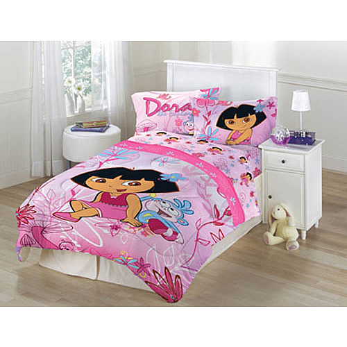 This twin-sized comforter features beloved characters Dora the Explorer and Boots surrounded by butterflies and flowers.