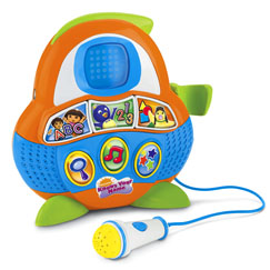 Introducing the 1-2-3 ABC Karaoke where features Dora, Diego, Pablo, and Ming-Ming buttons to choose a curriculum, numbers, ABCs or shapes.