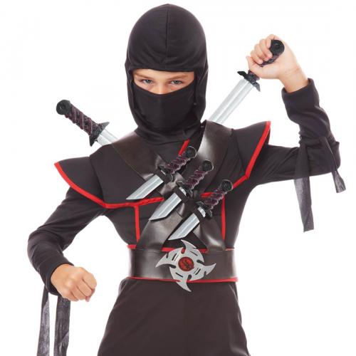 The Stealth Ninja child costume includes: Jumpsuit with Ties, Belt, Hood, Face Mask